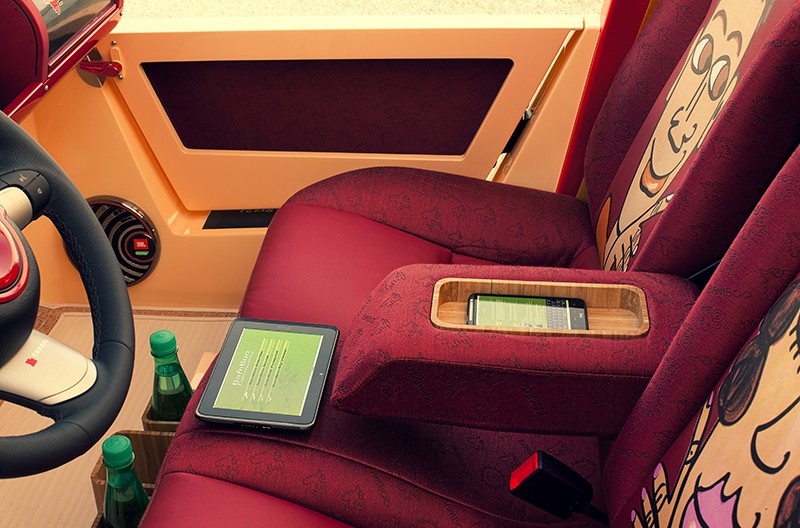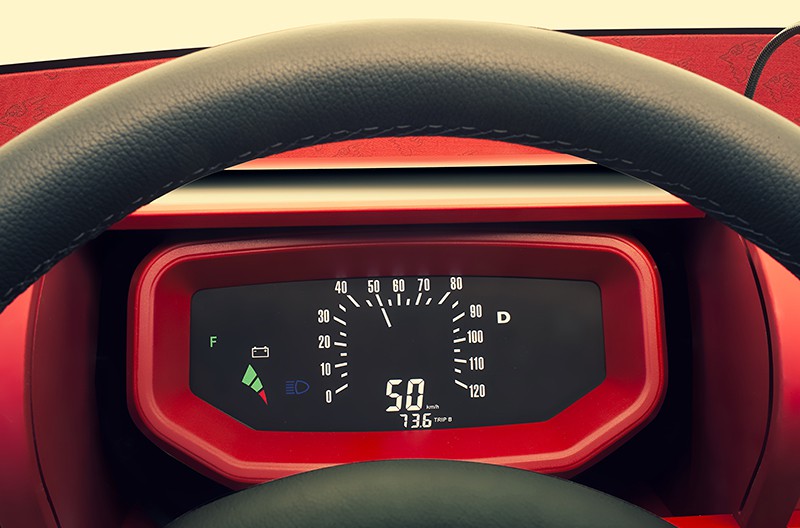 the dash is a sight to behold. sculptured in a shape that resembles an elongated bread box which stretches across the width of the car. this breadbox-like dash opens up in a breadbox fashion, revealing the control elements and the futuristic VDO display. to the far right of the glove box, a HTC Flyer seats in its docking station, ensuring that the driver and the occupants stay connected always. to the left of the steering wheel, is where you find a host of retro-listic toggle switches for lightings, horn et cetera and perched on top it is the key-start in the form of a Swiss Army knife. you can’t get anymore Swiss than this, can you?