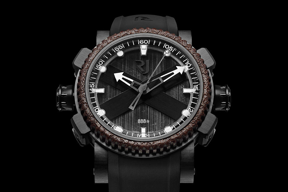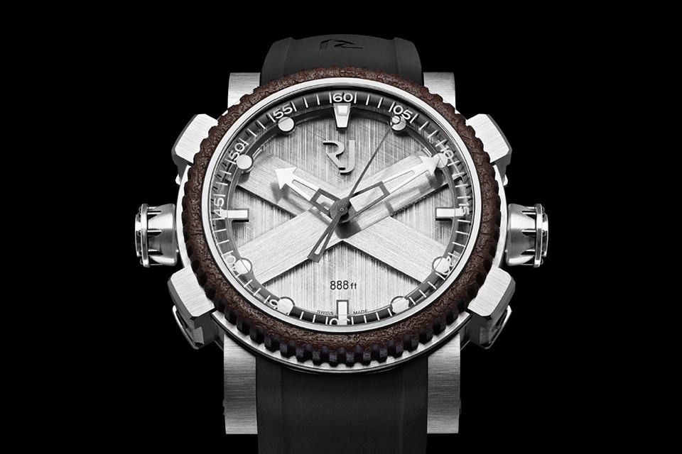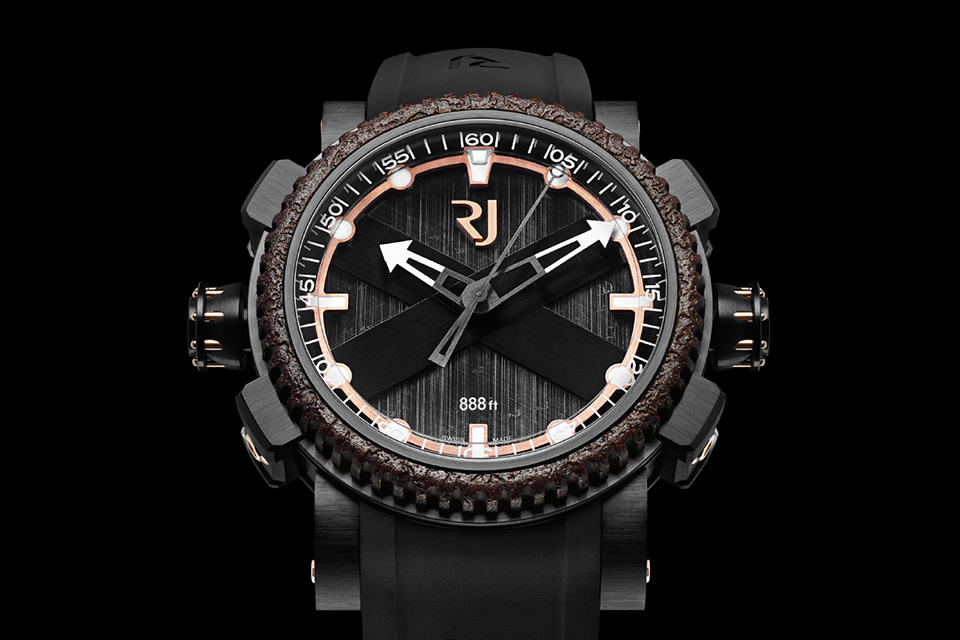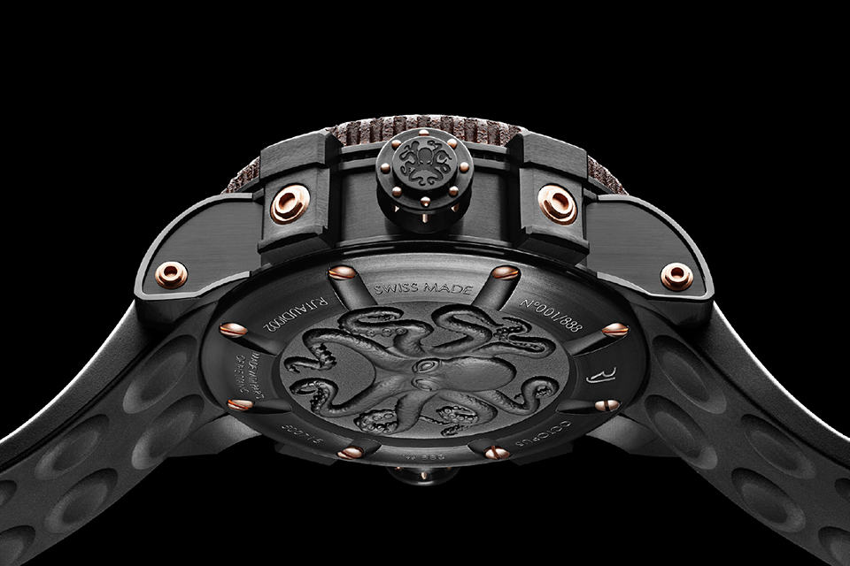 we know. those fishy friends deep in the ocean probably won’t appreciate the cool dive watch you have on your wrist but that doesn’t mean style-conscious divers shouldn’t slap a stylish dive watch on their wrist when they are exploring the deepest part of the deep blue. the RJ-Romain Jerome Octopus Watch is one of the latest stylish dive watch to join the market and the first foray into diving watch segment by the Swiss firm. this aesthetically stunning watch features two crowns: one at 9 o’clock for setting the time and another at 3 o’clock for the elapsed time controller. powered by RJ002-A2 mechanical self-winding movement, some of the highlights include a 46 mm case with eight octagon head screws, an exclusive internal uni-directional rotating sapphire bezel engraved with five-minute graduation, notched bezel finished with oxidized-look, Superluminova “blue emission” coated ring markers, luminescent hands, hand-engraved octopus on the caseback framed by eight screws, two screw-locked crowns adorned with eight rivets with intricately engraved image of an octopus, water resistance up to 888 feet (270 meters), satin-brushed traverse struts and paws, black rubber strap with an interior featuring octopus-type suction cups and a dial face depicting a large cross of St. Andrew’s flag which indicates the presence of divers practicing. the RJ-Romain Jerome Octopus comes in three versions: steel (dubbed ‘Metal Octopus’), black PVD-coated steel (dubbed ‘Black Octopus’) and black PVD-coated steel with red gold (dubbed ‘Red Octopus’). available from all RJ-Romain Jerome boutiques with a limited production run of, you guessed it, 888 pieces and for a grand price of €11,500 or US$13,750 each for the Metal and Black Octopus while the Red Octopus will set you back at €12,500 or US$14,900 a piece. click through for a few more larger views.