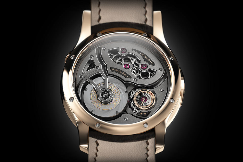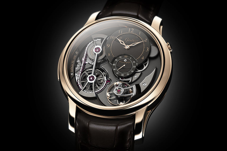 other features include the standard serving of hours, minutes and small seconds, a 60-hour power reserve (it is a shame that the power reserve indicator has to be located on the caseback, though), a 43mm red gold or platinum case, water resistance to 50 meters (150 feet), sapphire crystal with anti-reflection coating on both front and caseback, time-setting crown with sapphire cabochon at 2 o’clock, an in-house manufacture movement caliber, and alligator leather hand-stitched in Switzerland with metal pin buckle. rounding up the aesthetic department are the highest level of haute horlogerie finishing that encompasses hand polished screws and jewel countersinks, hand bevelled and polished bridges and plates. it is not known how much this awesome time piece will cost, or when it will be made available. check out a few more larger views in the mini gallery below and catch the product video further down, or learn more the Romain Gauthier Logical One HERE.
