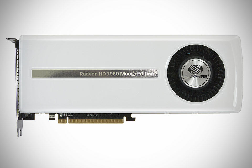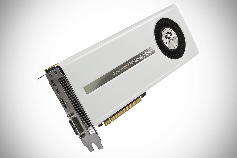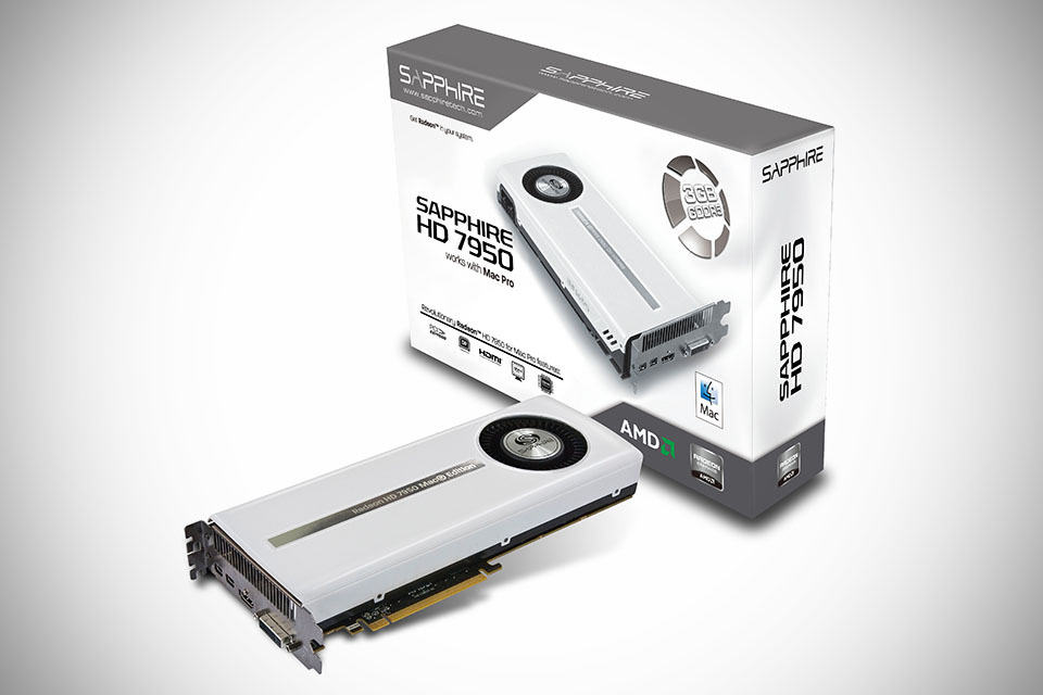 looking to give your ‘aging’ Apple Mac Pro desktop a boost in the graphics department? then you probably what to check out this new offering from Sapphire Tech: the Sapphire HD 7950 Mac Edition Graphics Card. this gleaming new graphics accelerator is based on AMD’s latest Graphics Core Next (GCN) architecture that promised to deliver a significant graphics performance in a wide range of applications including gaming, audio and video editing. the HD 7950 Mac Edition is said to boost gaming frame rates by over 200 percent, general benchmark performance by around 30 percent, while graphics intensive benchmarks get a jolt by as much as 300 percent when pitted against the NVIDIA GeForce 8800 GT that’s commonly found in Mac Pros. key features include 3GB of GDDR5 memory, Dual Asynchronous Compute Engines (ACE) that deliver up to 2.87 TFLOPS single precision compute power, a 3GHz HDMI 1.4a port, dual mini DisplayPort outputs supporting a massive 3,840 by 2,160 resolution per display when running on Mac OS X, Dual-link DVI port with HDCP (supports up to 2,560 by 1,600 resolution), AMD PowerPlay technology for automatic power management, and hardware support for Open GL 4.2 and Open CL 1.2, plus AMD HD3D technology and APP acceleration. the Sapphire HD 7950 Mac Edition Graphics Card is compatible with Apple Mac Pro models from 2010 onwards, as long as the machine has a PCI-Express x 16 slot to spare. a driver disk is included to enable the HD 7950 Mac Edition to function with Mac OS X 10.7.5, 10.8.2 or later. and oh, it has dual firmware support too (via a simple firmware (dual BIOS) switch). expect it to set you back at a hefty $479.99 when it hit the stores.