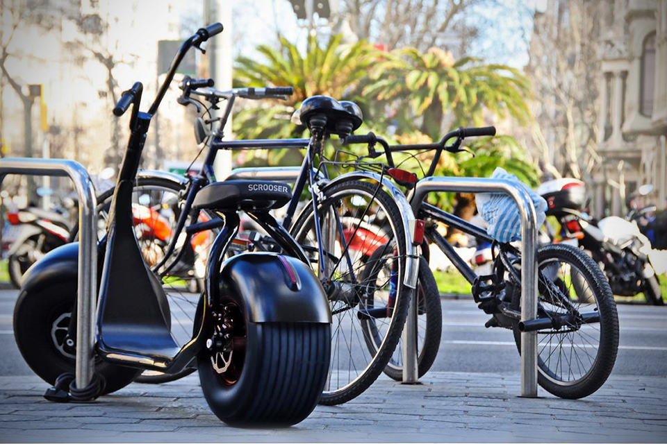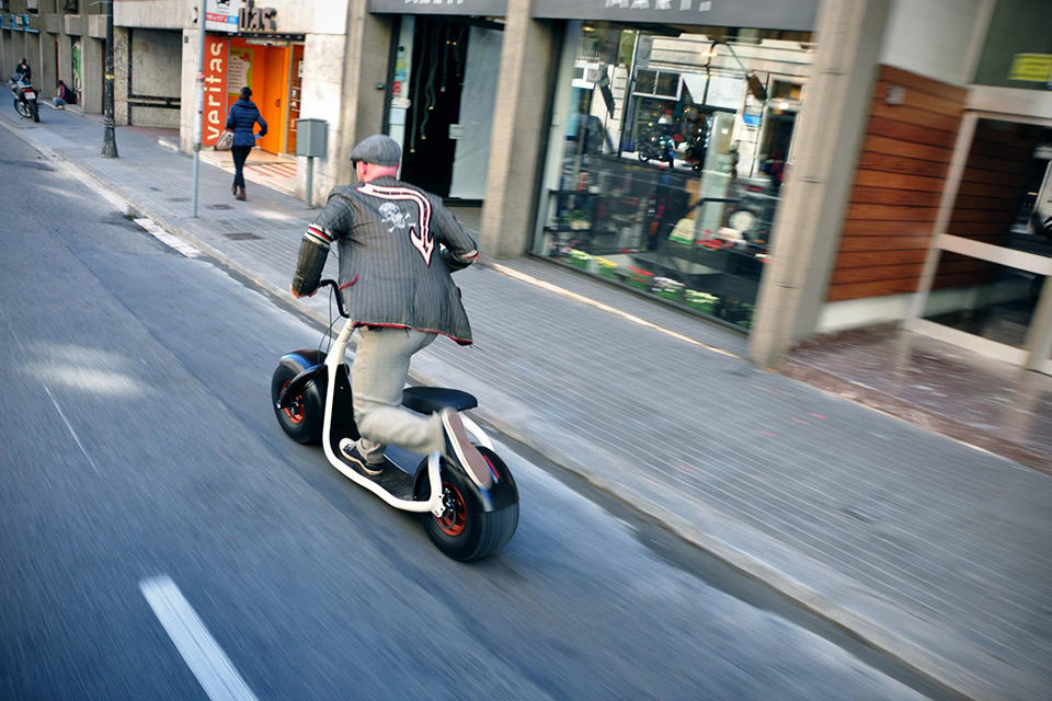 it sports an aluminum frame and is capable of hauling a rider of up to 275 pounds (125 kilograms – hey, i am qualified!), but the scooter itself is pretty lightweight – tipping the scale at just 61 pounds, or about 28 kilograms – making it easy to move around even if you are not relying on its green power. stopping power comes from a front hydraulic disc brake, as well as an internal electric motor brake. there’s no mention of regenerative braking, so we can assume that it isn’t equipped with one. according to its maker, Scrooser Manufactory, the battery is good for up to 25 days on regular use and it takes between an hour to 3.5 hours to fully juiced. the folks have taken the Scrooser to Barcelona for trials and it was there that it had the honor of being nicknamed the Harley Davidson of the sidewalk. sounds pretty rad, doesn’t it?