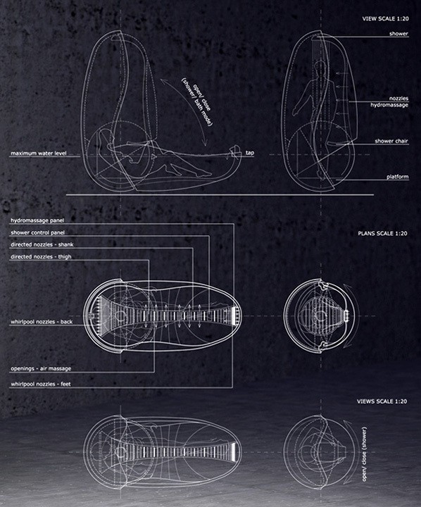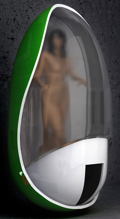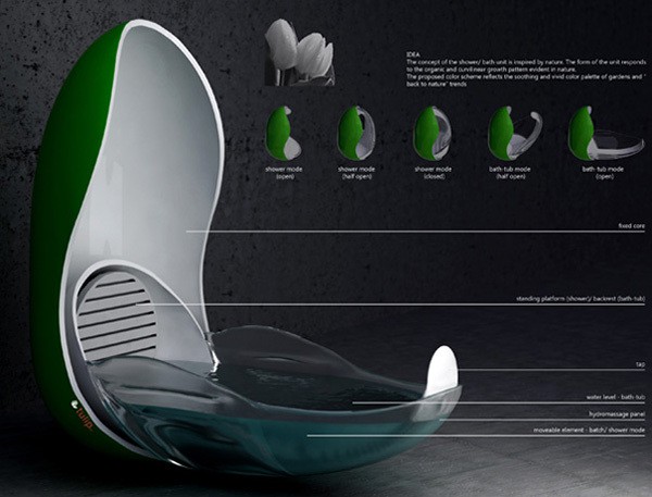 this is exactly what designer Piotr Pyrtek has in mind for the Tulip Bathtub and Shower Unit. designed with small bathrooms in mind, this unit sits compactly upright as a shower unit with a silhouette resembling a tulip flower. when you feel like a good bath, a portion of the unit flips down and you have a glass bathtub complete with underwater jets, hydromassager and programmable sequences to take the stress of your day away.