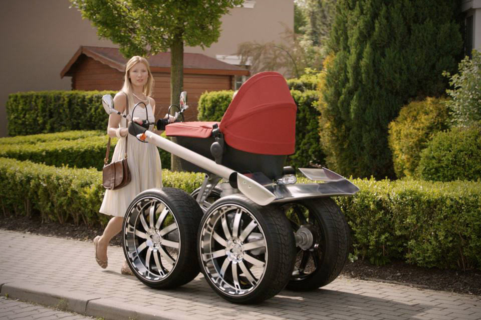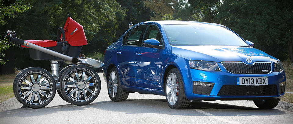 as you can see from the image above, this upsized baby stroller (hence the namesake “mega”) comes complete with wing mirrors, high-spec brakes with brake lights, headlamp, hydraulic suspension, massive 20-inch alloy wheels shod in all-terrain tires, oversized brake calipers, anti-stress push-bar grips, and a sports-style upholstery to match the rest of the “vehicle” and also to complement the latest Octavia vRS sports sedan. we have always liked the German-owned Czech marque, especially the Octavia, and as you would have imagined, we are totally digging the Skoda vRS Mega Man-Pram Baby Stroller – if only they were real – so yes, it is a concept released in conjunction to the Octavia vRS and starred in the recent Skoda Octavia vRS TVC, which you can watch it below.