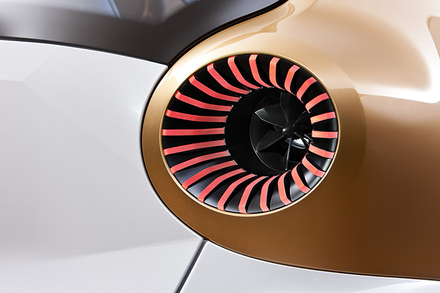 The jet-like rear lights are reminiscent of small aircraft turbines and give the rear a futuristic and sporty look. Inside the lights, small propellers convey the air from the inside to the outside. In addition to all the light functions needed, transparent stacks in the form of rings around the lights also show the charge status of the battery during charging.