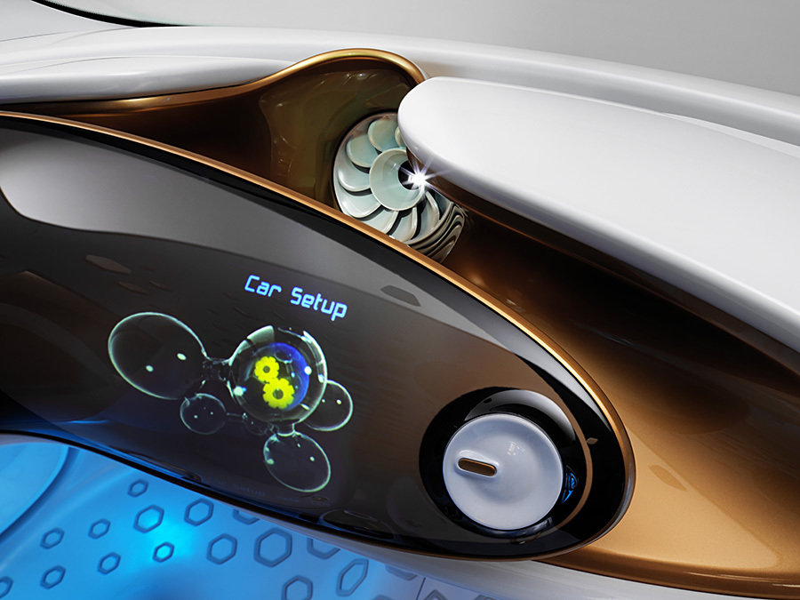 The elliptical user interface with a copper coloured frame – matching the lightweight tridion – is semi-transparent when switched off. When the vehicle is switched on all cockpit information is then projected onto the transparent surface. The driver uses a touchscreen to switch between operating menus.