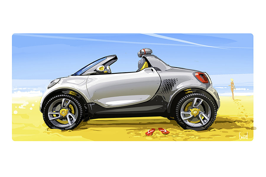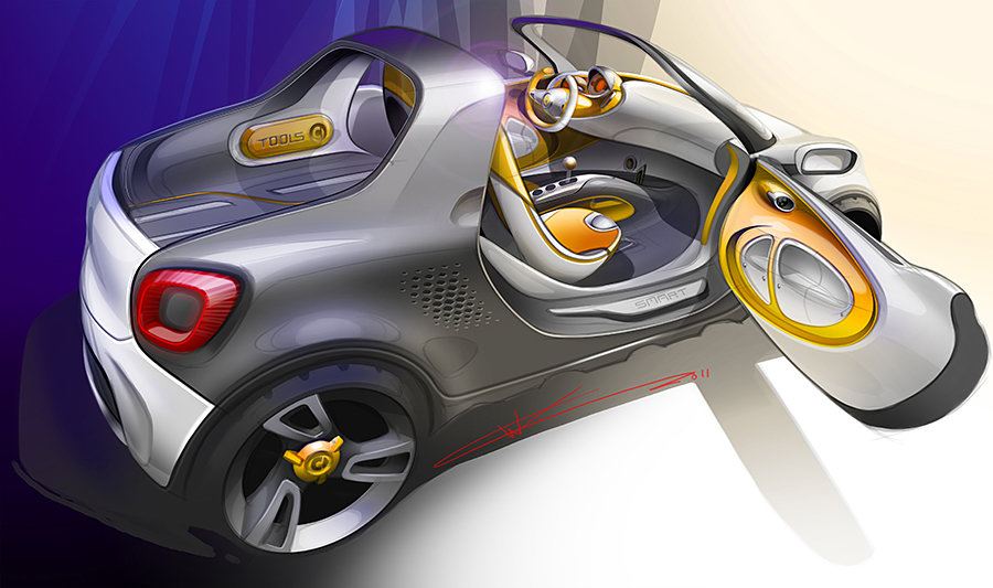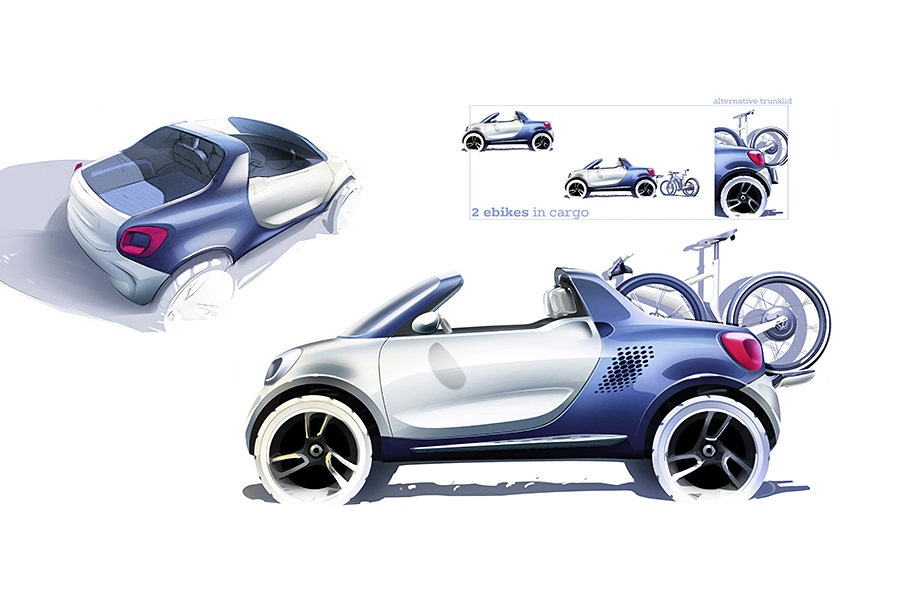 the smart for-us is fitted with a 55kW magneto-electric motor with a healthy 130 Nm (96 lb-ft) of torque that promised to offer a lag-free acceleration and a top speed exceeding 120 km/h. other features include a wider stance, electrically operated tailboard, slide-down tailgate, smartphone integrated rear-view mirror, hammock-style shell seats, and a 17.6 kWh lithium-ion battery that provides the juice. the idea of a smart pickup truck begs for our attention and though aesthetically, it has the same effect on us but we find that it has an uncanny resemblance to the Mini Countryman. sorry, we just can’t help it. the smart for-us concept electric pickup truck will make its world premier at the North American International Auto Show (Detroit Motor Show). for the lucky souls who could be at the NAIAS, you will have an opportunity to get a glimpse of this beautiful concept in person but for those who can’t, simply roll past the jump and feast yourself on a gallery of renders and concept sketches.