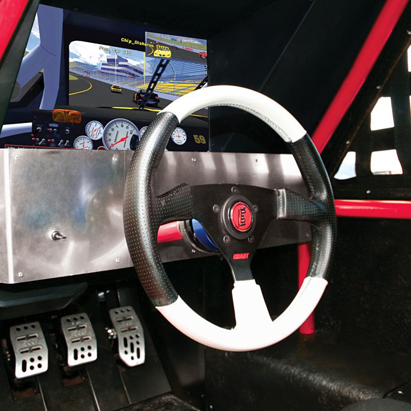 other goodies include fluid-dampened steering wheel, paddle gear shifters, complete set of pedals in aluminum that include accelerator, brake and clutch, a padded racing seat and a 5.1 sound system for the added audio realism. the actual gaming hardware consists of a gaming PC preinstalled with ARCA Sim Racing, and a 22-inch widescreen LCD display that offers a glorious 1680 x 1050 resolution to keep your eyes peeled on the track. the ARCA Sim Racing included here is arguably the best stock racing simulation software that money can buy today. it offers virtual race car driver 21 legendary stock car tracks, including our all-time favorite Daytona International Speedway. finally, a fiberglass shell with detail decals and netted windows covers its steel frame roll cage provides for an even more realistic racing environment. FYI, race queens are not included.
