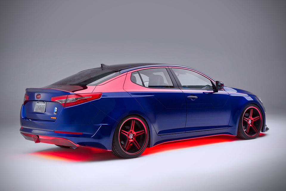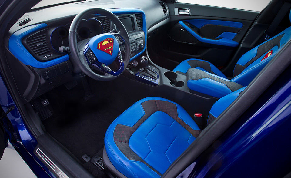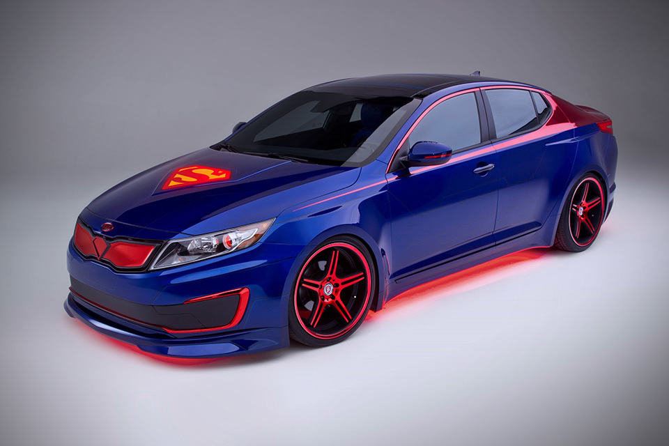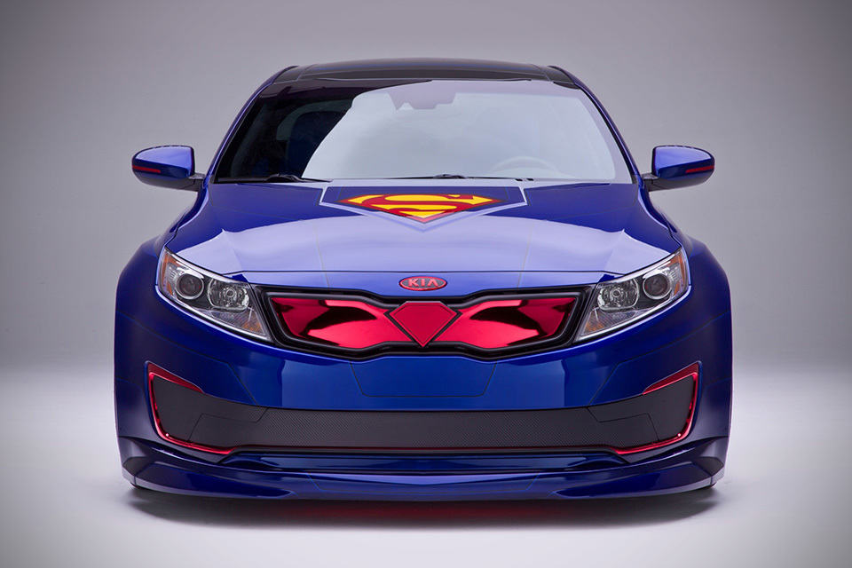 even if Superman did have a four-wheeled ride, it wouldn’t be a regular sedan but for the rest of the mortals (or in this instant, earthlings), the Superman KIA Optima Hybrid Sedan, should be enough to show your undying love for the Man of Steel. unveiled at the recent 2013 Chicago Auto Show, this superhero-inspired ride is the sixth of the eight Justice League themed vehicles turned out by collaboration between the Korean automaker and the comic book company. unlike its superhero counterpart, this Superman KIA Optima Hybrid does not wield any unworldly power and its innards, specifically the drivetrain, remains pretty much untouched. for the uninitiated, the Optima Hybrid is powered by a 2.4-liter four-cylinder full parallel hybrid system that offers a combined output of 206 horsepower with a peak torque of 195 lb-ft and is mated to a six-speed electronically controlled Sportmatic transmission. obviously, this ride is more down-to-earth (pun intended) then the superhero whom it drew its inspiration from. externally, custom features of this one-of-a-kind vehicle includes a dark metallic blue and chrome red paint scheme, the familiar Superman’s chest emblem on the hood and the trunk, red glowing headlamps, an artwork specially designed by Jim Lee on the rear window, huge 22-inch wheels matched to its flared fenders and a height-adjustable suspension controllable from the cockpit. the Superman theme continues into the interior with custom upholstery in, you guessed it, the blue theme (surprisingly, no red) and a good number of the superhero iconic shield featured within. take a few more look in a small gallery below. also catch the official unveiling further down the page. learn more about the Superman KIA Optimal Hybrid Sedan HERE.