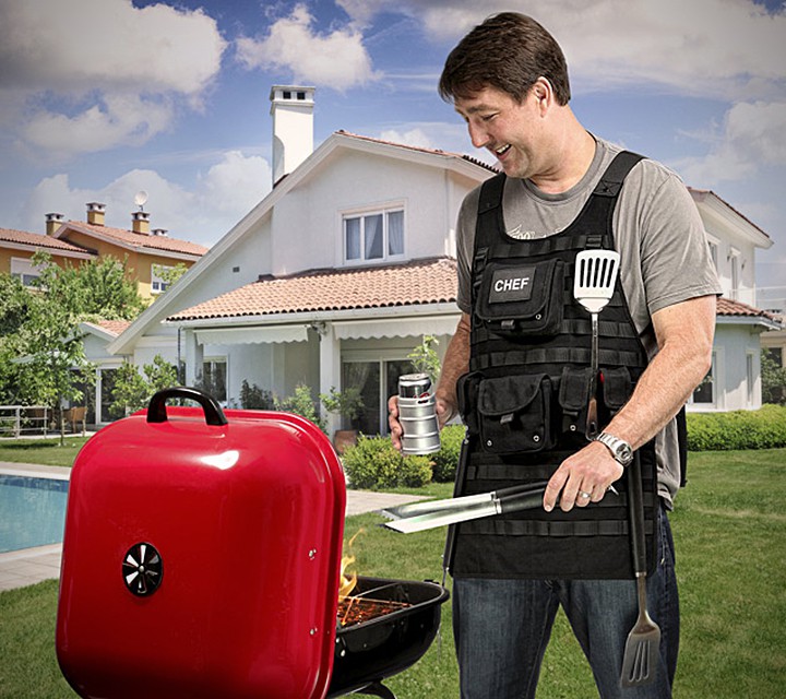 if the act of BBQ often means a battle for you, then you might actually need to consider equipping yourself with the Tactical BBQ Apron from ThinkGeek. this is the BBQ (or kitchen) equivalent of the tactical vest that SWAT wears, except that it won't protect you from projectiles of any form. against splatter of oils and occasional spills, yes, but bullets and stuff, no.