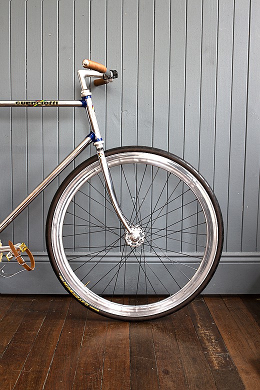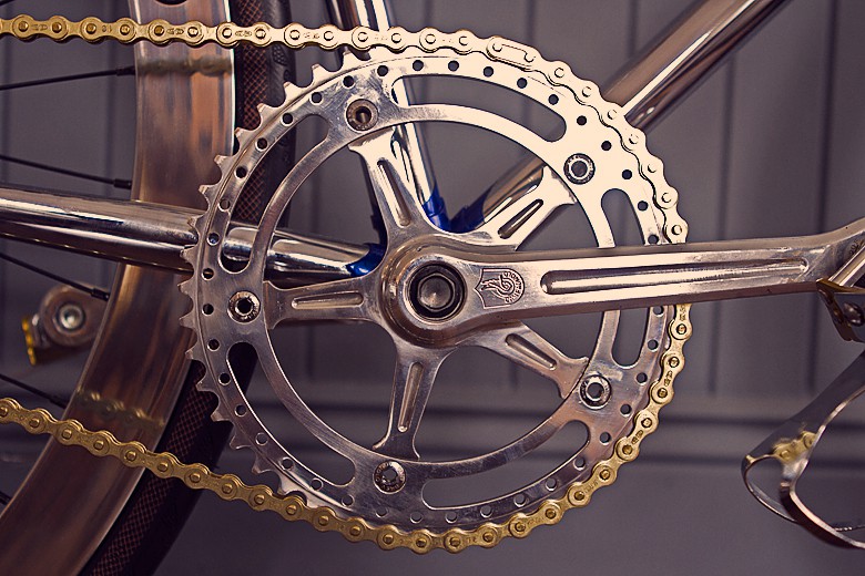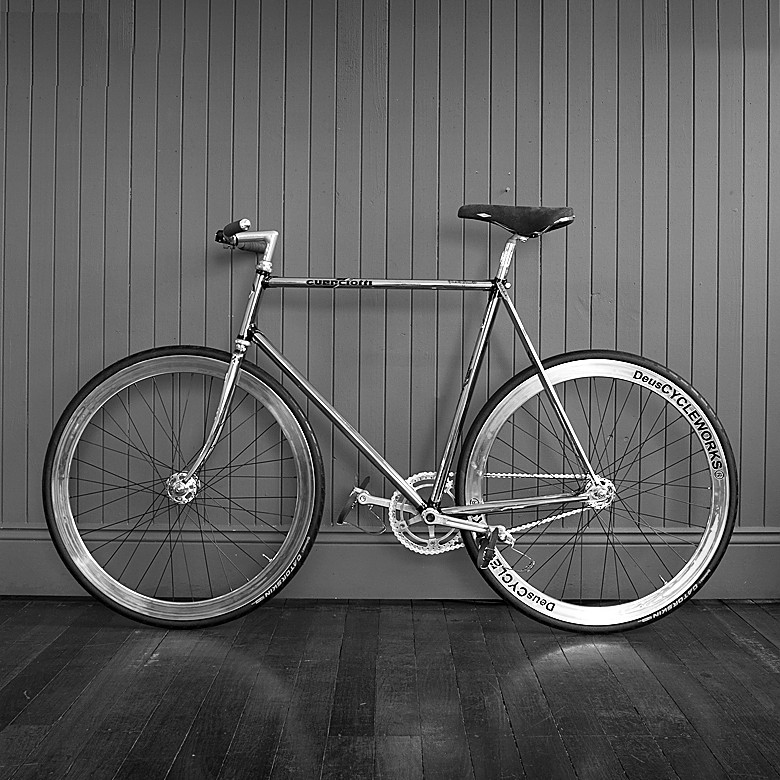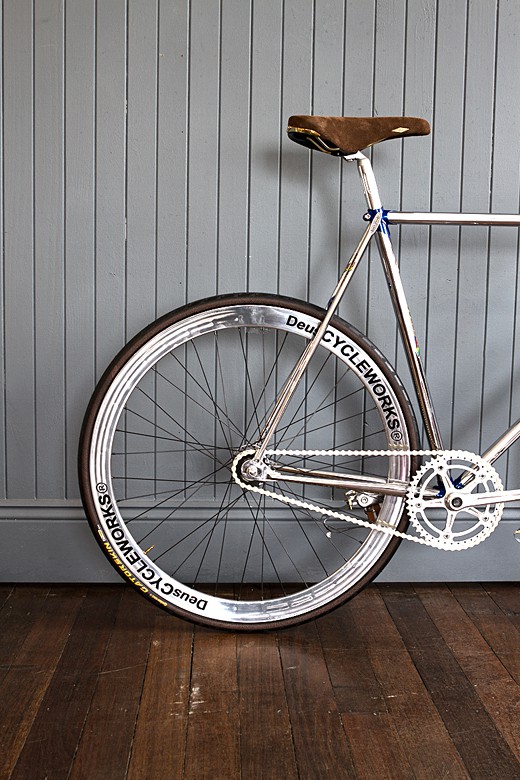 it’s easy to make your pedal-powered ride stands out but having it stands out and yet not look silly is not easy. unless you have a ride like the The Frenchman’s Guericiotti by Deus. lovingly put together by DeusCYCLEWORKS, this sweet two-wheel ride features a beautifully re-chromed Guericiotti frame and fork, accented with painted lugs, hand polished B43 wheels with Campagnolo pista hubs wrapped in Continental Gatorskin tires, MKS pedals with toe clips, nitto pearl stem with Soma arc bars wrapped in Dipell bar tape, record head set and pista cranks from Campagnolo with custom chain ring from Cycle Underground, and the Izumi chain finished the pedal-and-chain system. topping of the package is the record seat post, also from Campagnolo, and an awesome looking San Marco Rolls saddle. unfortunately, you won’t be able to buy this baby, at least for now but instead, head past the jump and treat yourself to some images of this stylish pedal machine. trust us, you won’t want to miss those images.