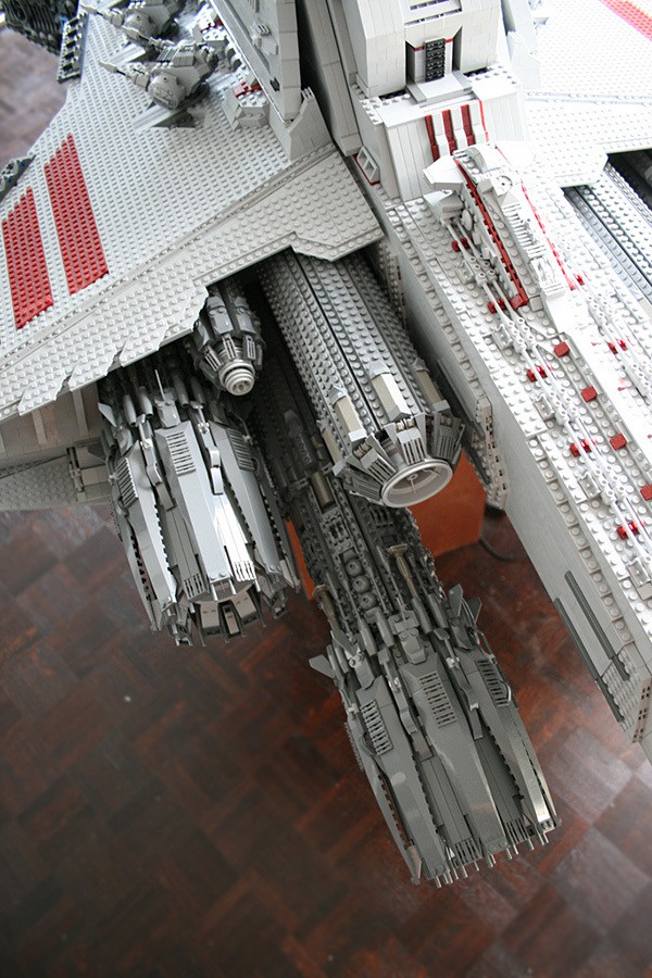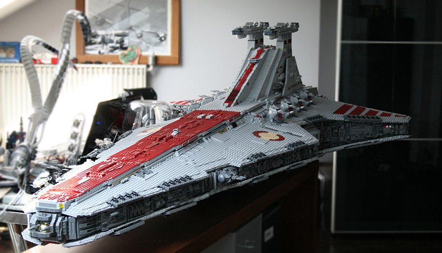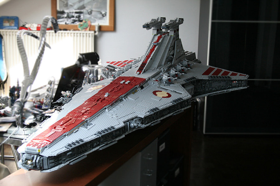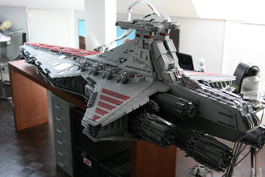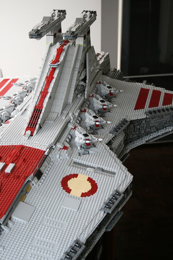 if you thought the LEGO Super Star Destroyer (#10221) was huge, then you have yet to see this non-kit, fan built LEGO Ventator-class Star Destroyer created by one Iomedes (aka Sylvain Ballivet). the mind-boggling 43,280 pieces of LEGO bricks used versus the 3,152 pieces of the #10221 kit, should let you in on just how huge is this scale LEGO model. inspired by one LEGO model designer, Erik Varszegi who had built one back in 2005 to promote the Star Wars Episode III movie, this LEGO juggernaut measures an incredible 2.44-meters (8-feet) long, and weights 82-kilograms (180-pounds) – a statistic which practically dwarf the LEGO Super Star Destroyer. all said, i hereby take my hat off to Iomedes for the patience and LEGO skills he possessed. only one word could describe this LEGO Ventator-class Star Destroyer: awe-inspiring. hmm, or was that two words? never mind. blast pass the jump for a video ‘tour’ and more images of this awesome creation.