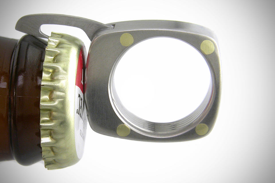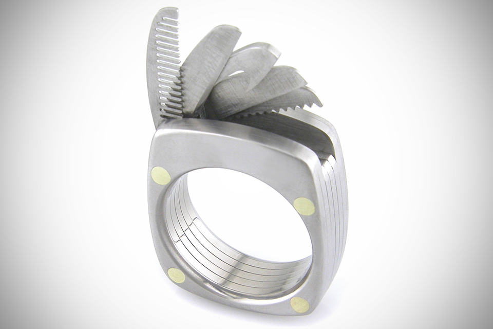 seriously, we think a man shouldn’t wear any ring at all – less, you are married but still, we advise you not to but (and that’s a big but) if you really need to wear one, then make sure it is the Titanium Utility Ring by Booner Titanium Rings. dubbed as “The Man Ring”, this ring may not bear the power of the mythical Green Lantern power ring but it sure does offer you some handy (albeit, miniature) fold-out tools, including a comb (for the mustache, we supposed?), a straight blade, a bottle opener, a serrated blade and even a saw – packed into a 9mm-wide, brushed finish aerospace-grade titanium ring. if Victorinox ever make a ring, this is probably how it will look like. and oh, in case you are wondering, the ring size is customizable to your finger, so that it will most definitely fit your finger and there is also an option for engraving, though the individual titanium plate that made up the ring might affect how the engraving will turn out. The Man Ring: Titanium Utility Ring can be yours if you have $385 to spare. a few more look at the ring ‘in action’.