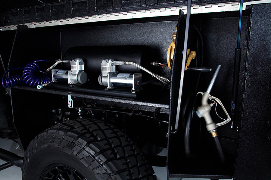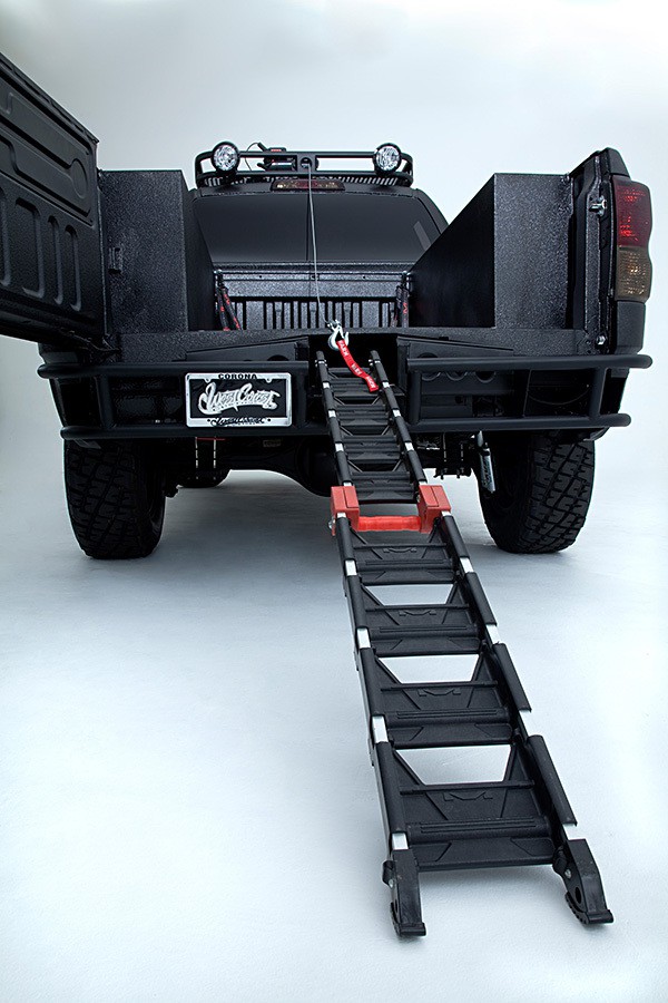 An array of modifications were built into this special Tundra enabling it to tackle the roughest terrain and it’s equipped with everything a Motocross rider requires. Modifications include a suspension lift from Camburg Racing, shocks by Fox Racing, KMC 18 x 9-inch wheel mounted to General 35 x 12.5 x 18 tires, custom rough-texture paint by Line-X, a roof rack that can also be used as a viewing deck, fold-up bed sides, a suicide tailgate, a gas pump and water pressure washer located in the bed, an air compressor, a winch to load bikes, a hidden ramp, custom embroidered interior and much more.