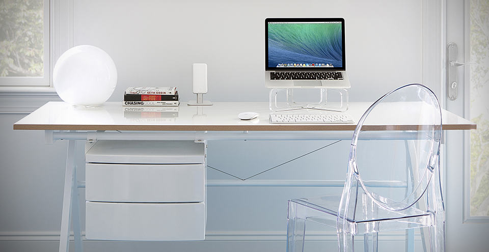 it is no coincidence that the new Twelve South GhostStand sounds a little eerily similar to the iconic Ghost Chair by Philippe Starck, cos’ that awesome plastic that was designed for our butts is actually the inspiration behind this desktop stand for MacBook. if you are fan of mid-century, post modern decor, this transparent stand might just be your cup of English Breakfast. granted that plastic is hardly a material of choice for a laptop stand, but by employing a crisscrossed blades design, this desktop stand for MacBook has in fact achieved two things: first, it is now completely sturdy enough for your laptop to rest on; and secondly, it is aesthetically pleasing, allowing the stand to blend seamlessly with any contemporary decor (we thought it will turn out best against white background and white themed furniture).