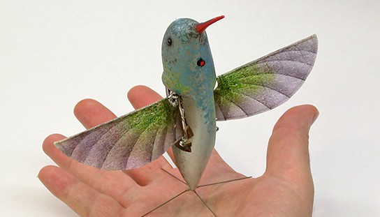 the demonstrator was hand-made and has a wingspan of 16-cm and weights a mere 19 grams. cramming all the electronic innards necessary including the batteries into such a tiny body and yet having full flight control characteristics is itself, a marvelous technological feat. aside from precision hovering, the Nano Hummingbird can climb and descend vertically, fly forward and backward, fly sideways and as well as rotating in both directions.