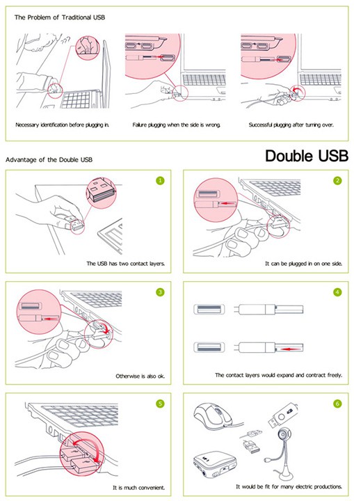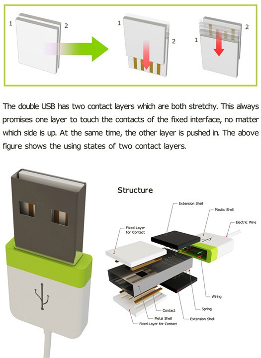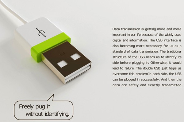 how many times have we curse silently when we get the direction of the USB plug wrongly? i have met with countless of such incidents and i wonder why the USB interface has to be directional-sensitive? the frustration adds up when the USB ports are located behind like on a standard CPU and iMac. lucky for us, designer Ma Yi Xuan has a concept called the Double USB which could solve our misery of plugging in the wrong side. need i say more? i hope manufacturers will take heed, start making the Double USB and saves us a few seconds of our life each time we plug it in.