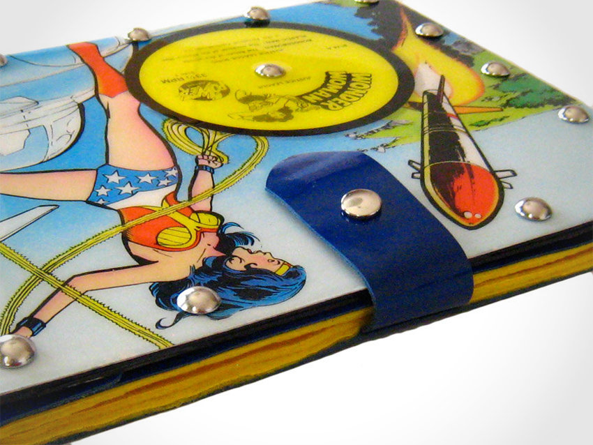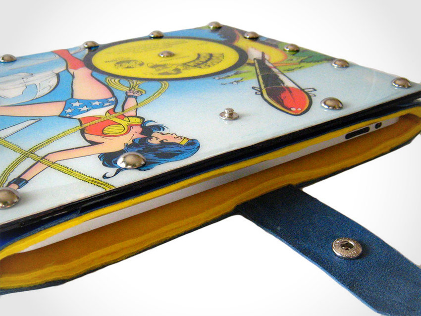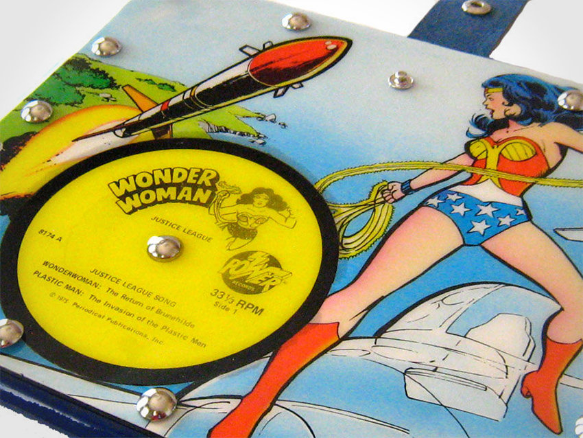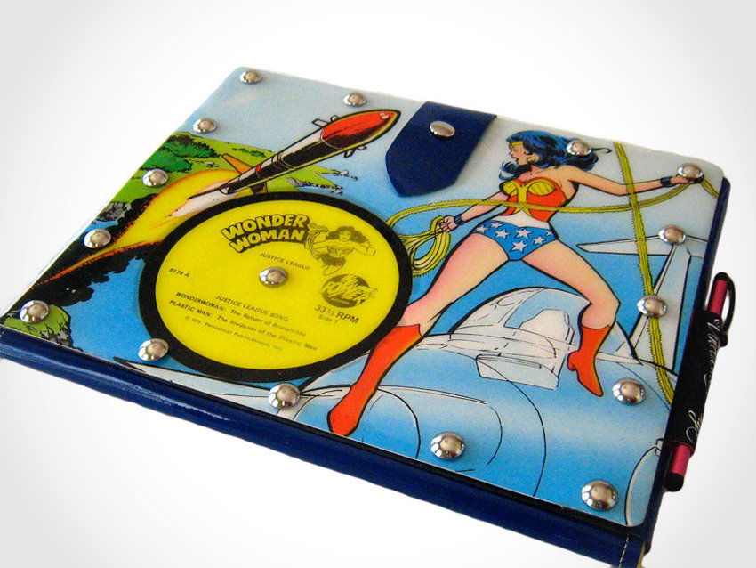 vinyl records are almost obsolete today, though there are still staunch fans who swear by them. if you happen to be in the aforementioned category, then you would probably dig the Vinyl Record upcycled iPad Case. handcrafted from an actual story record album, this lovely case (or you could call it a sleeve) features the image of our childhood fantasy (we blame it on Lynda Carter), Wonder Woman and the Justice League of America that dates back to the 1970s. completing the case is the real patent leather in an electric blue hue, double lined with yellow fleece that offers ample protection for your iPad and a snap closure, also in blue leather with nickel hardware, keeps your iPad from falling out. other features include nickel hardware, UV resistant clear acrylic resin coated cover, and a handy tab to hold your stylus, if you have any. as with most hand made vintage upcycled products, expect some blemishes or scuffs here and there, which only adds to the case’s uniqueness. the Vinyl Record upcycled iPad Case is created by Etsy seller, Vindicated Vinyl and is available for $90 a pop. check out a few more closer look after the break.