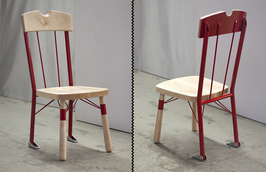 it is apocalypse and the world as we know it, is gone. holed up in your fortress, you reinforced your windows as you would for an imminent tornado hit but what about the doors that are still vulnerable to the undead’s intrusion? you could have all your furniture against it with little or no intention that you will ever use the door again or you could jam a chair under the doorknob that could give way in due time, or you could use this purpose-built door jamming chair, aptly dubbed as the Who’s There Chair designed by California-based industrial designer, Daniel Ballou. as the name implies, it is a chair with a door jamming purpose built into it. it features a steel structure to meet the most brutal punishment, a notch on its solid maple wood backrest for a slip-free fit to the doorknob, and leveling feet with rubber grips for that extra reassurance that this chair won’t slip off when the door banging routine starts. unfortunately, this chair seems to be a prototype at this point in time, thus whether it will ever be made is still a mystery to us but still it is a nice piece of work to be appreciated by anyone who deem apocalypse is inevitable or who is constantly worried about home intrusion or just about anyone who love a good practical design. check out a few larger views after the break.